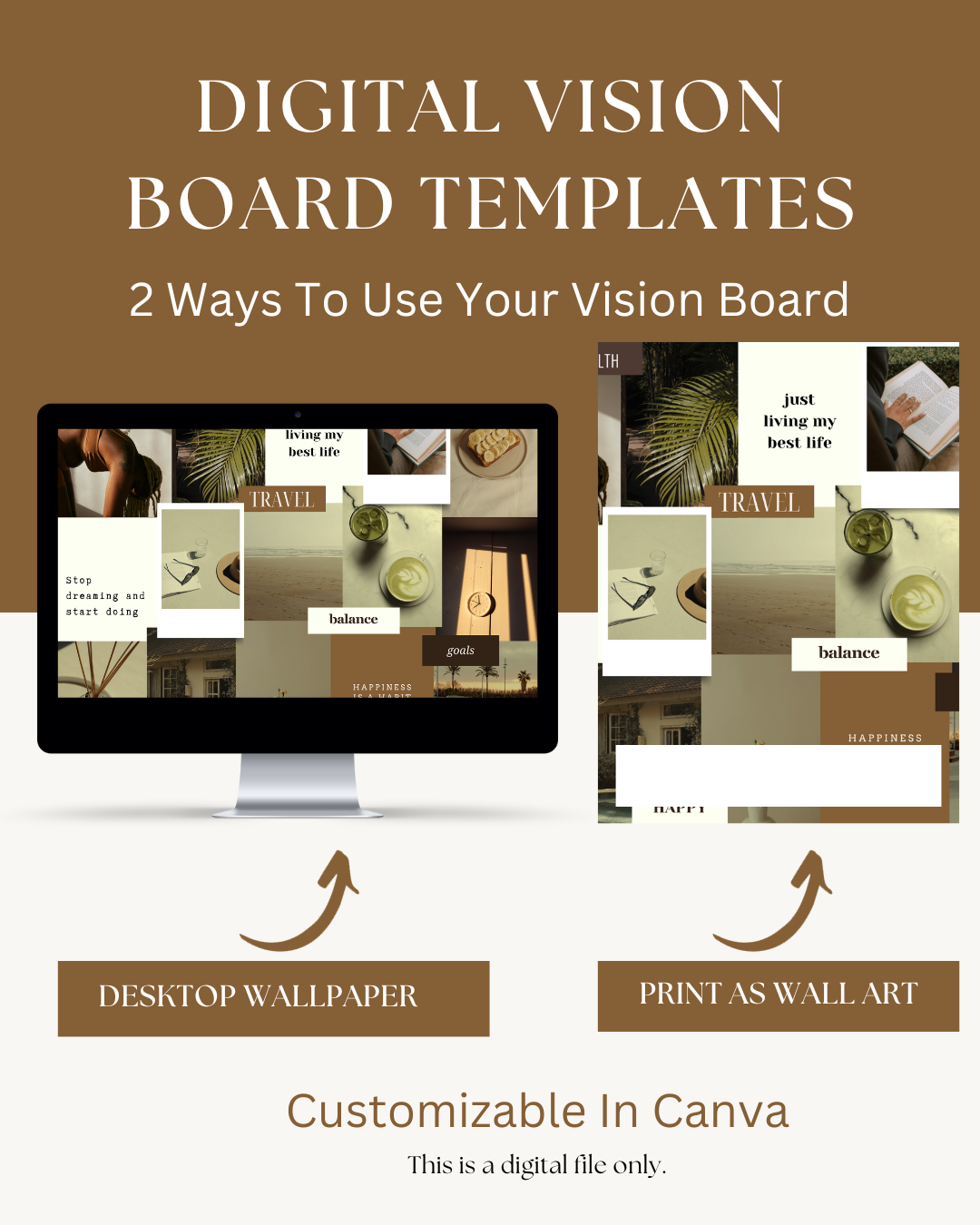 Are you ready to reset, visualize and achieve your dreams and goals? If so, check out my 2 fully customizable and editable Canva Vision Board Templates. With these digital dream board templates, you can easily drag and drop your own Canva images and customize the digital vision board template with your own colors, labels and vision and goals.